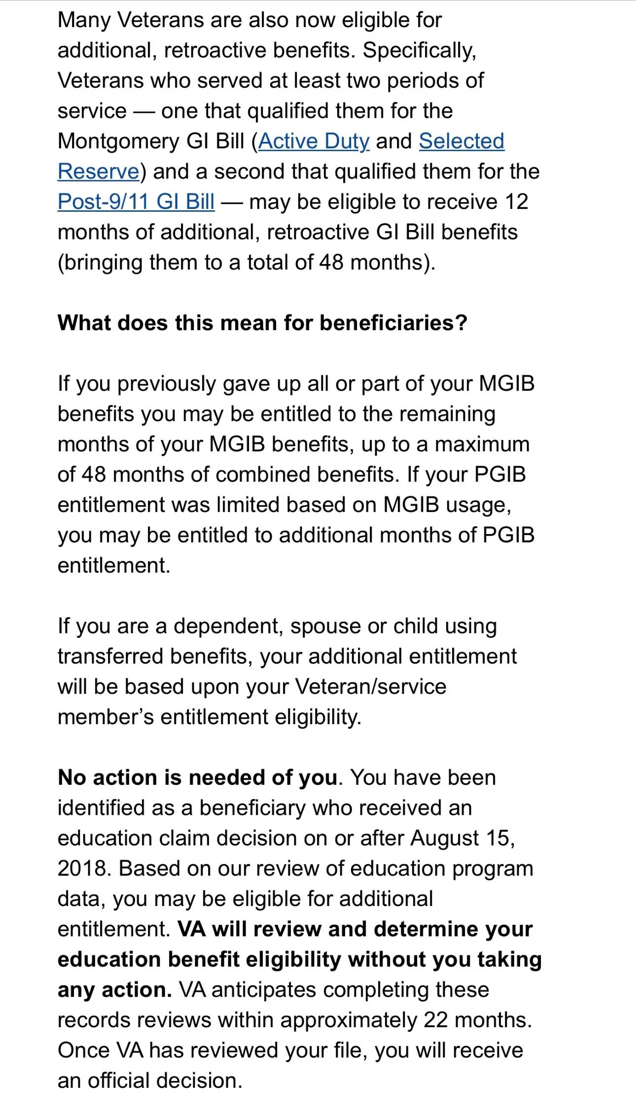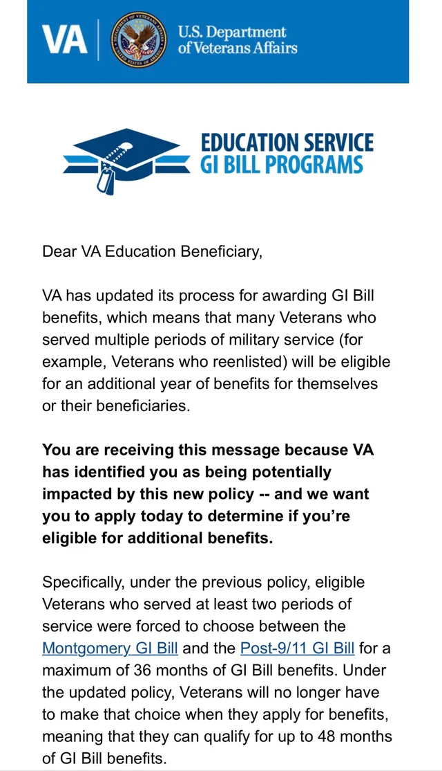 The extra benefits are then usable by qualifying veterans for a broad range of education, including undergraduate, graduate, vocational, and other on-the-job training. The VA has also developed new simplified application processes to ensure veterans have an easy time accessing the new benefits.